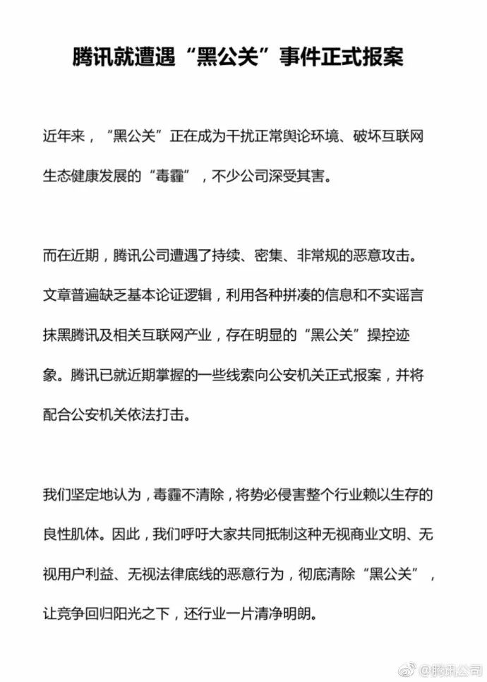 今天上午,腾讯宣布将近期掌握的一些“黑公关”线索向公安机关正式报案,并将配合公安机关依法打击。