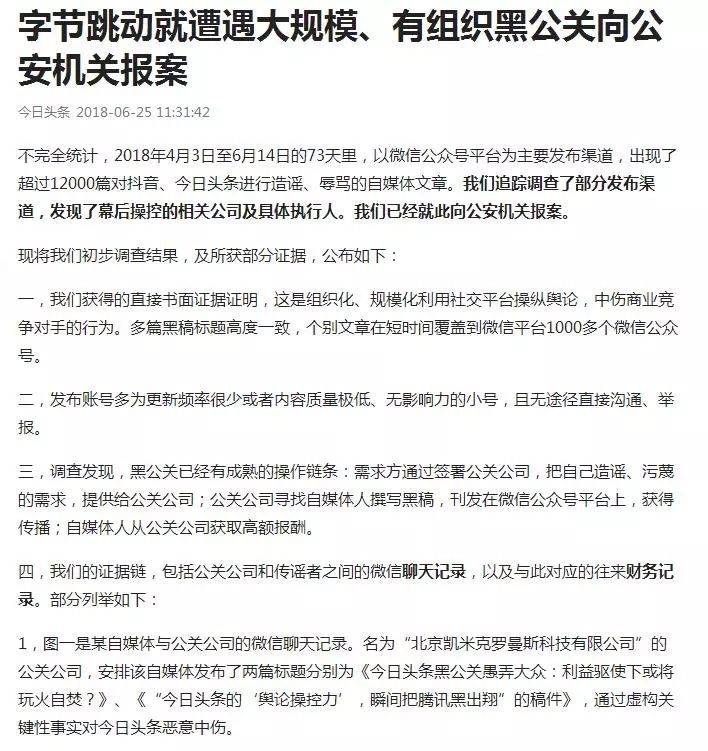 同样也是今天,今日头条发布声明称,近日微信公众号等渠道出现了超过12000篇对抖音、今日头条进行造谣、辱骂的自媒体文章。目前发现了幕后操控的相关公司及具体执行人。今日头条已经就此向公安机关报案。