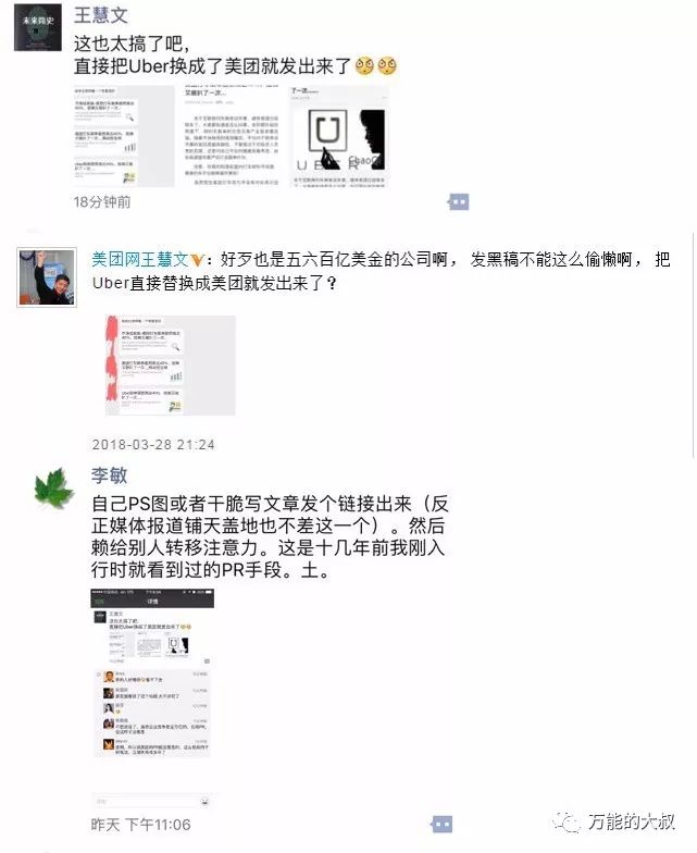 就在这几天,美团点评高级副总裁王慧文在微博和朋友圈公开指责滴滴发黑稿,并附上了截屏。随后滴滴公关负责人李敏在朋友圈回应称,自己PS图片或者写文章发链接出来,给别人转移注意力,是十几年前的PR手段。