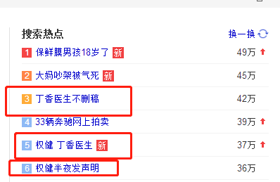 今天上午的百度热搜前6条,丁香医生和权健占了一半。